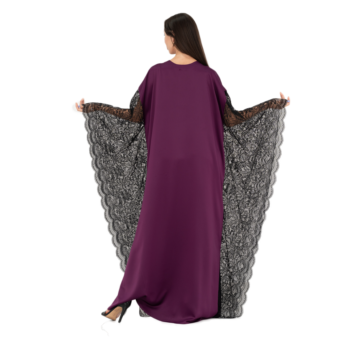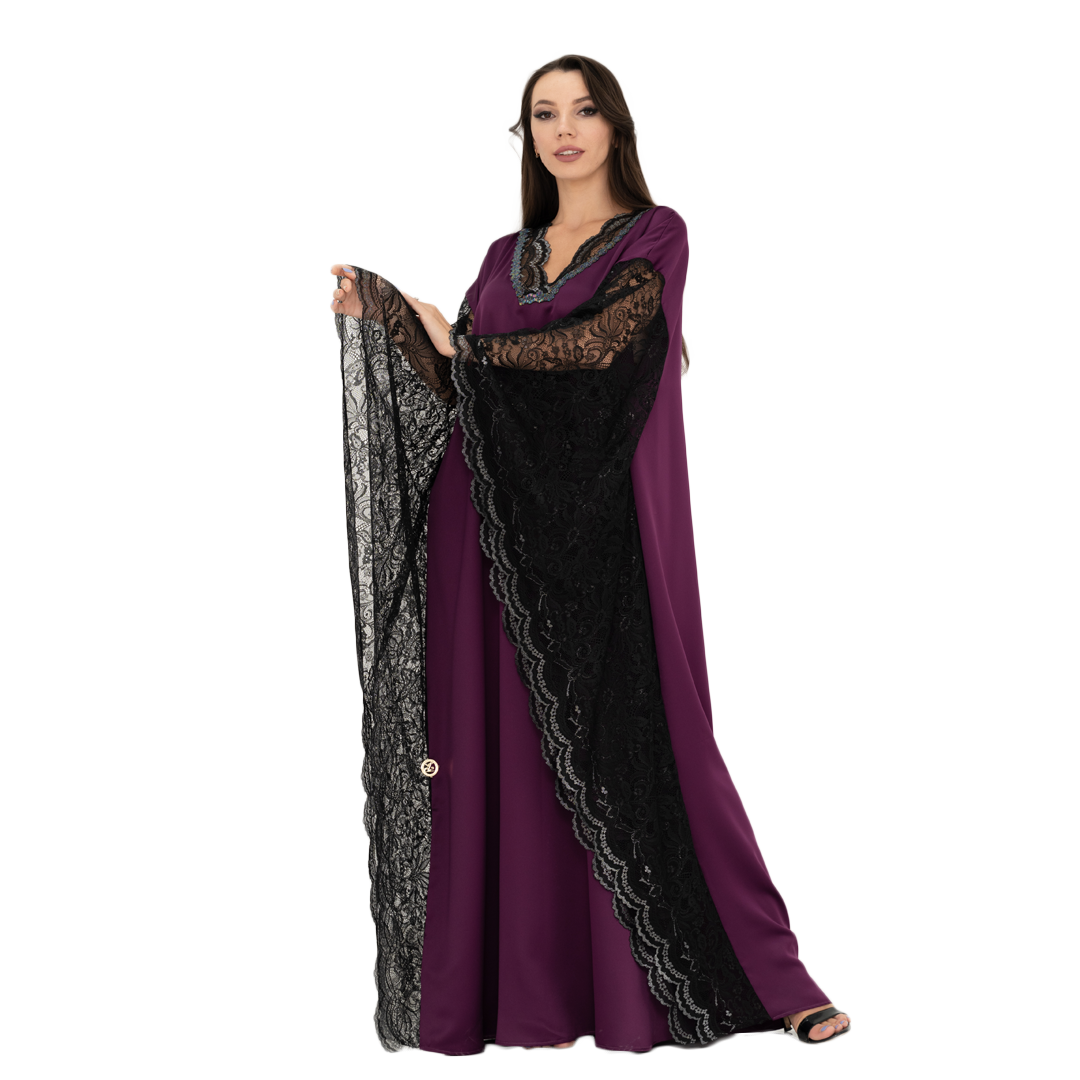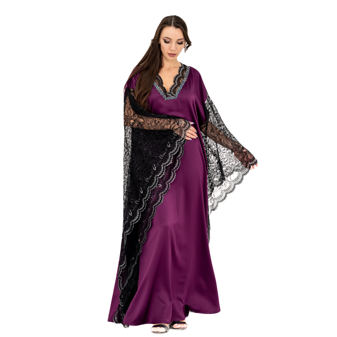 Make a stunning entrance with our Enchanting Evening Purple Kaftan, designed to captivate at special occasions and evening events. This exquisite long dress combines luxurious satin with intricate lace details for a look that’s both glamorous and sophisticated.