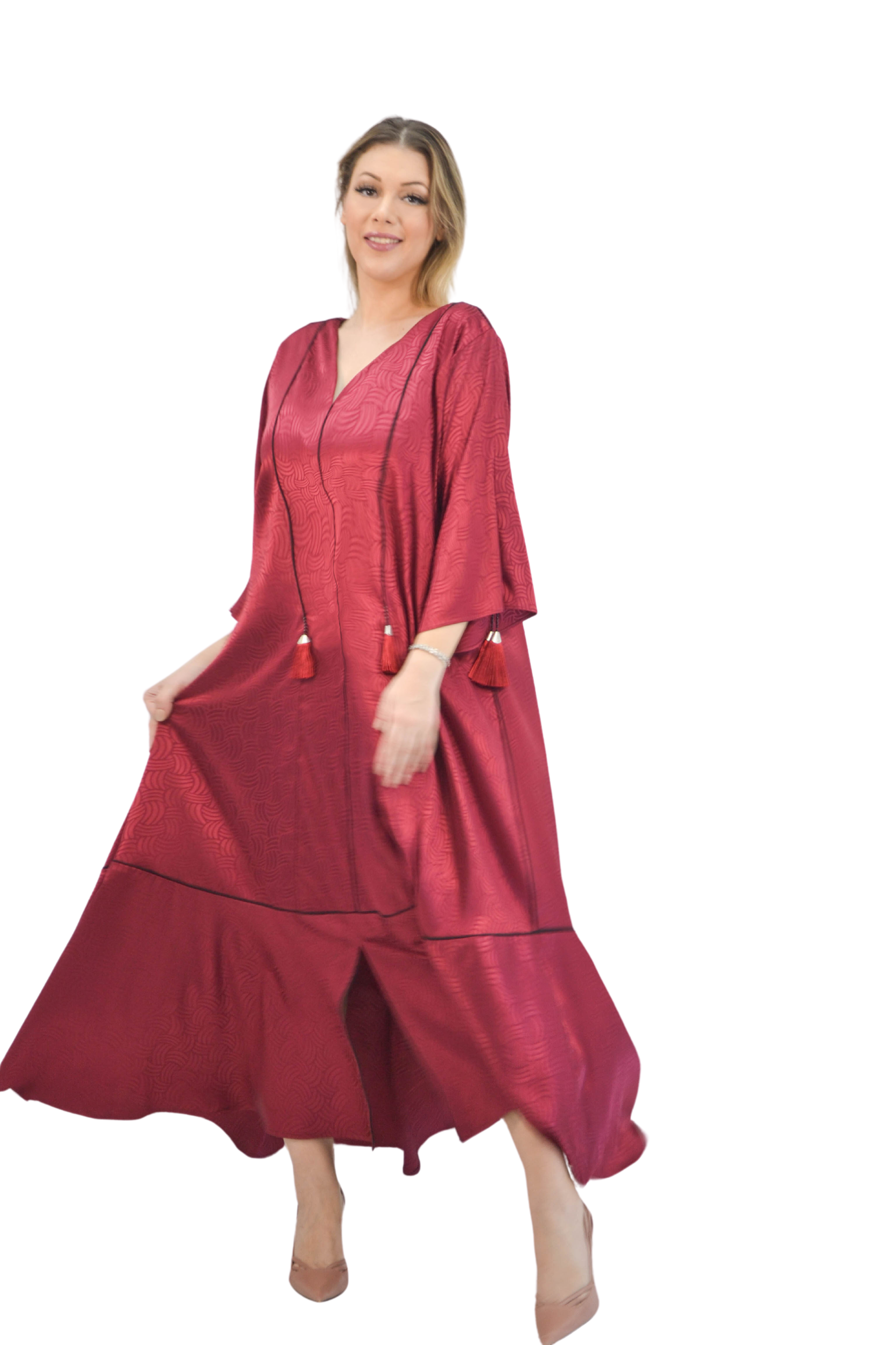 - Design: Flared silhouette with a flattering V-shaped neckline, tassel details, and a chic front slit with a ruffled hem.