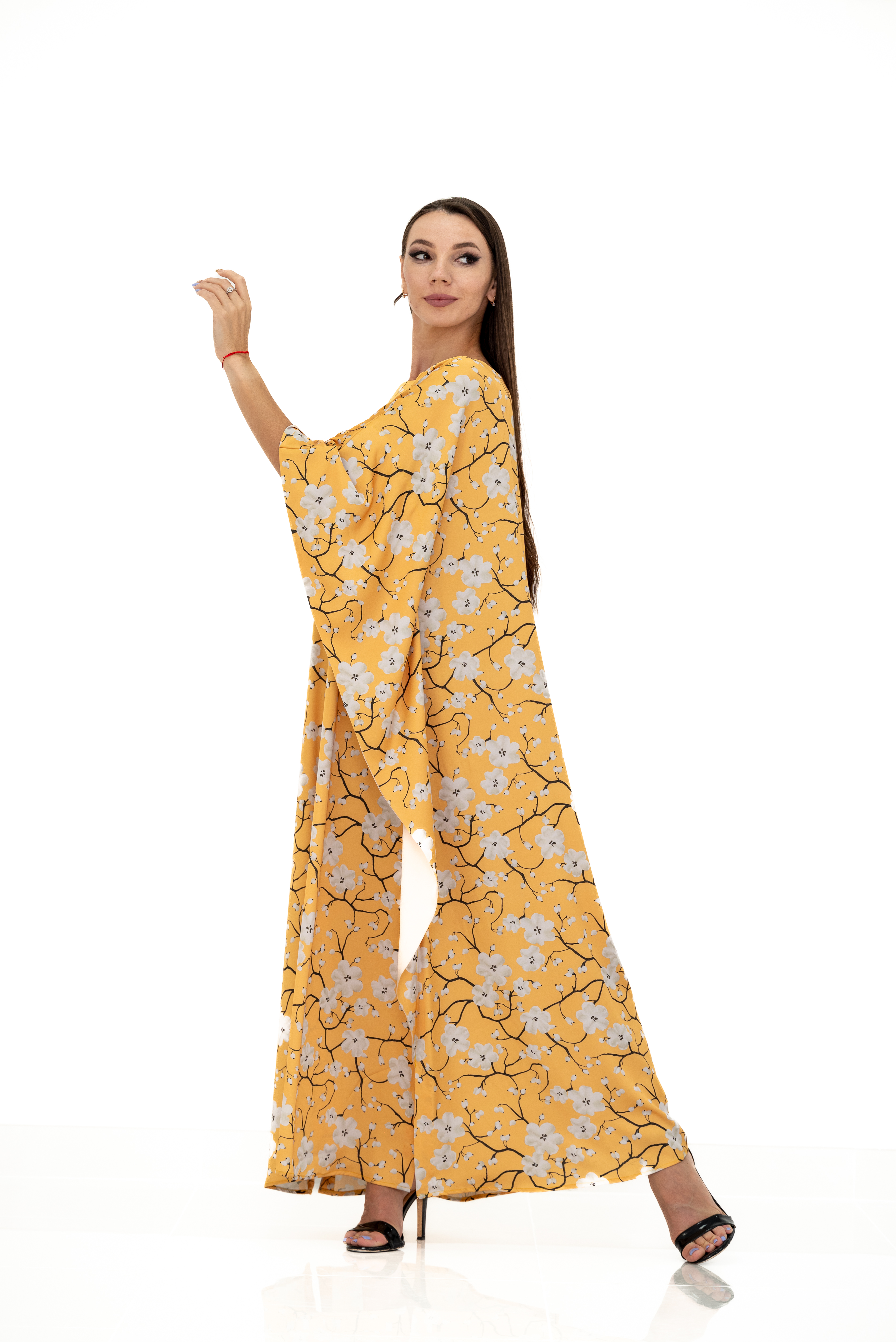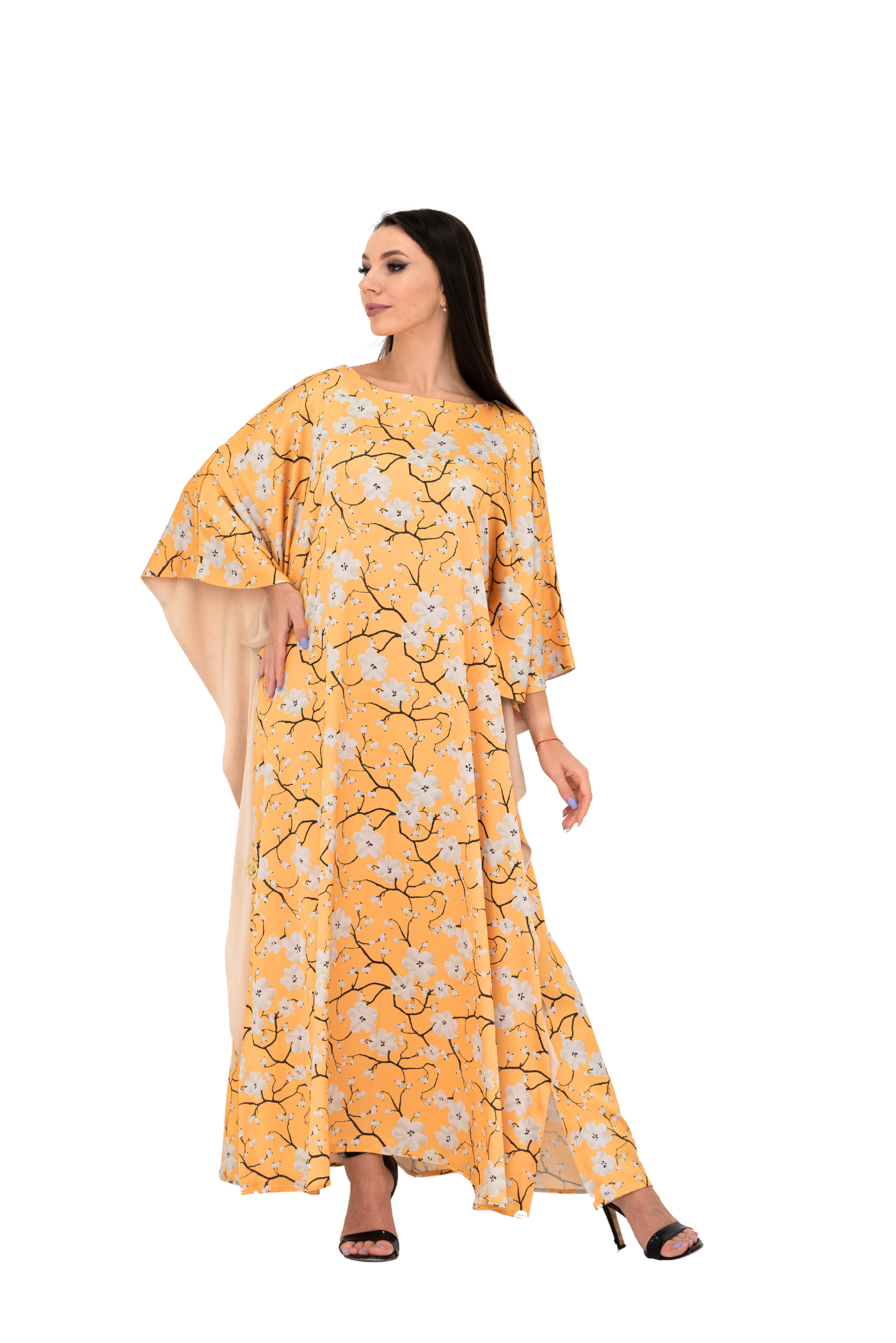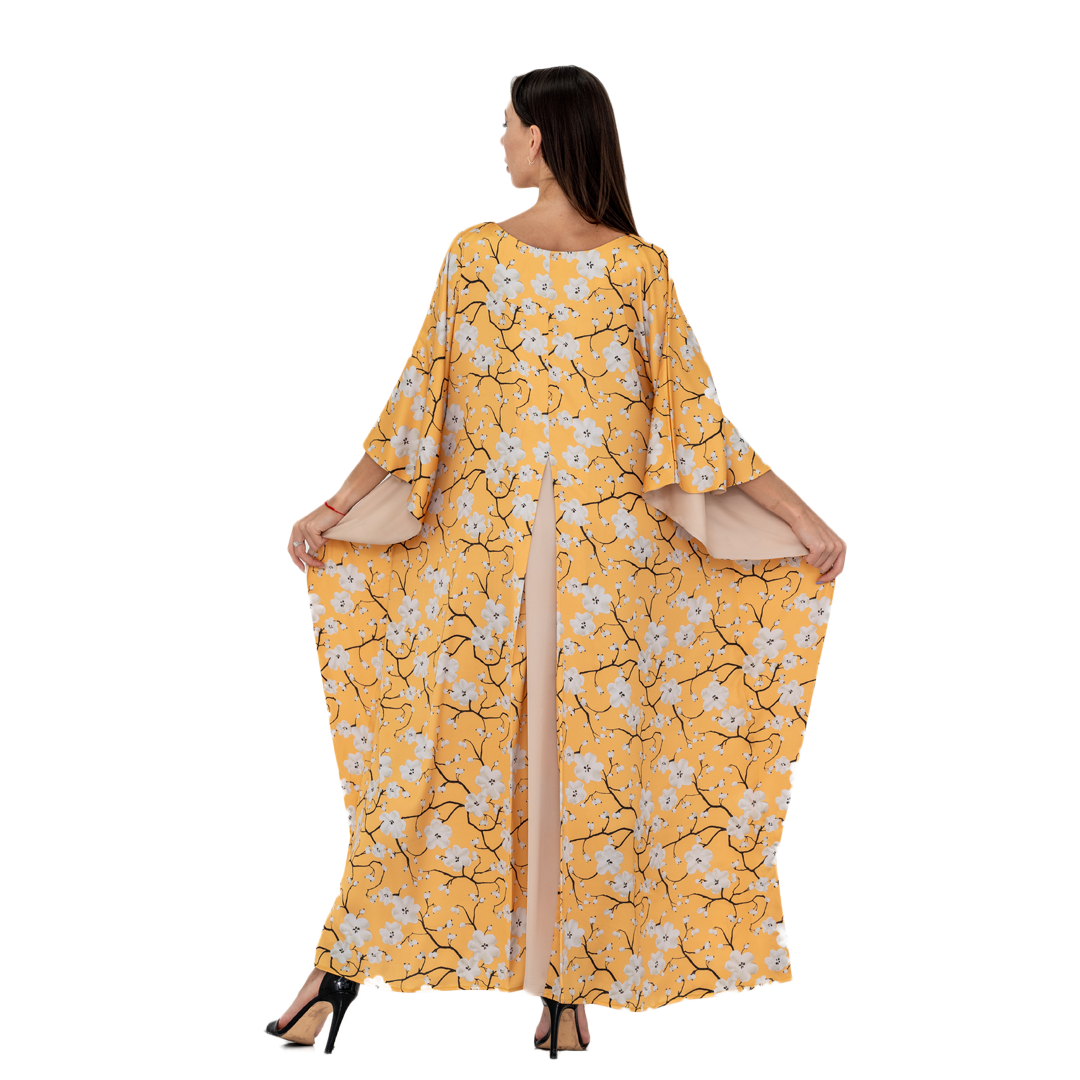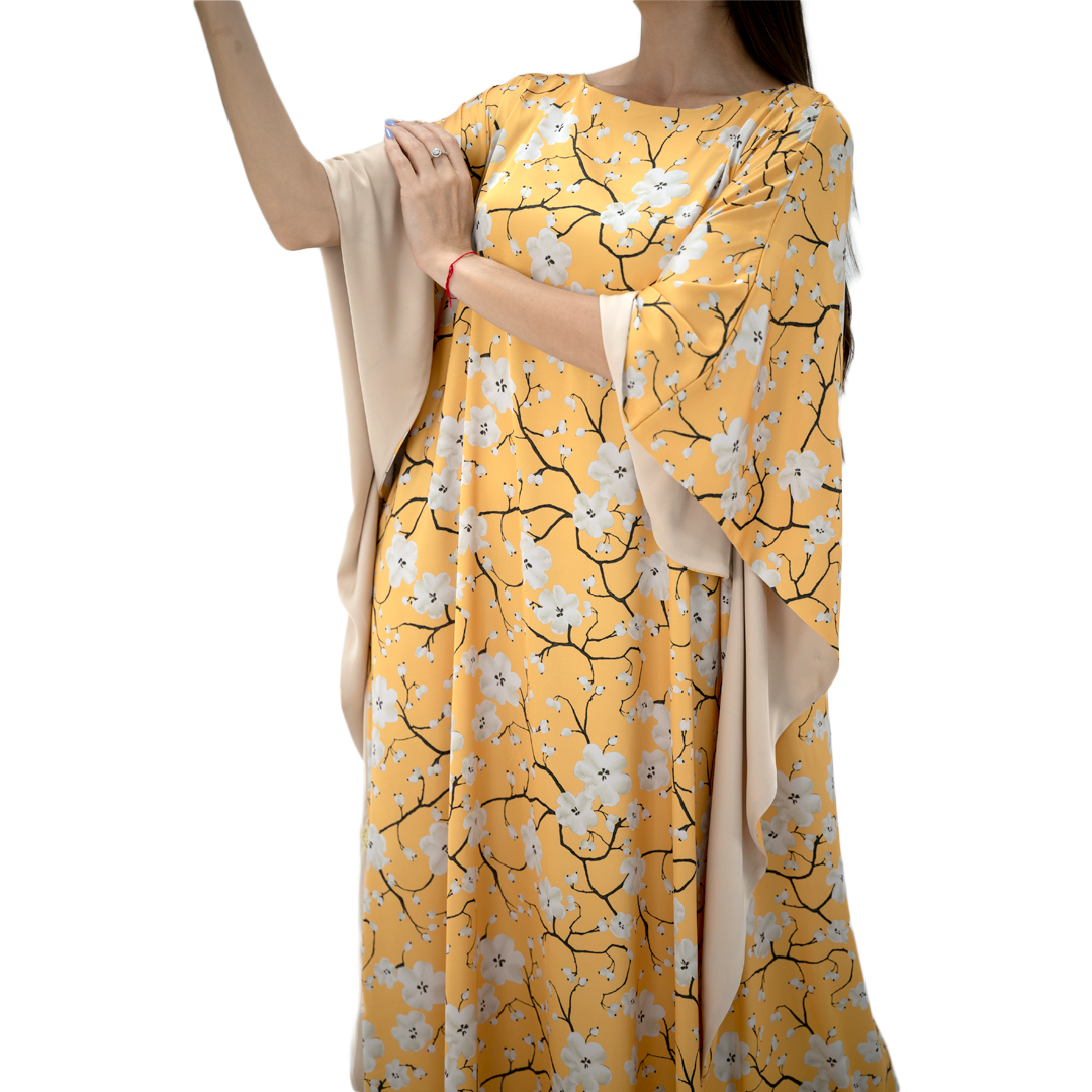 - Vibrant Sakura Floral Print: Featuring a stunning yellow satin fabric adorned with delicate Sakura floral prints, this kaftan dress brings a touch of nature’s beauty to your summer wardrobe.