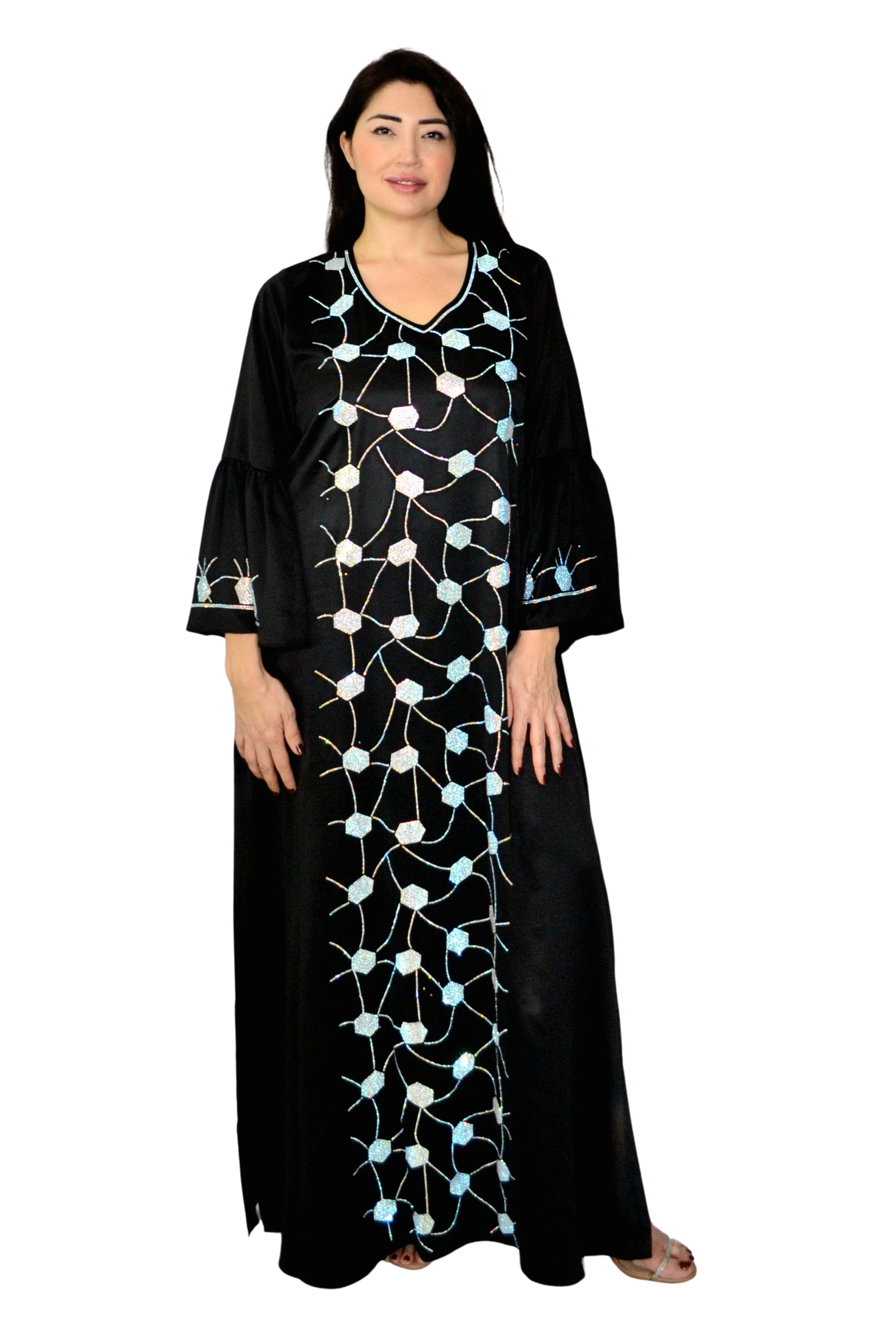 Step into grace and sophistication with this stunning embellished kaftan, crafted from smooth, breathable fabric for ultimate comfort. Designed to make a statement, this elegant piece features exquisite stone detailing, adding a touch of sparkle and luxury to your look.