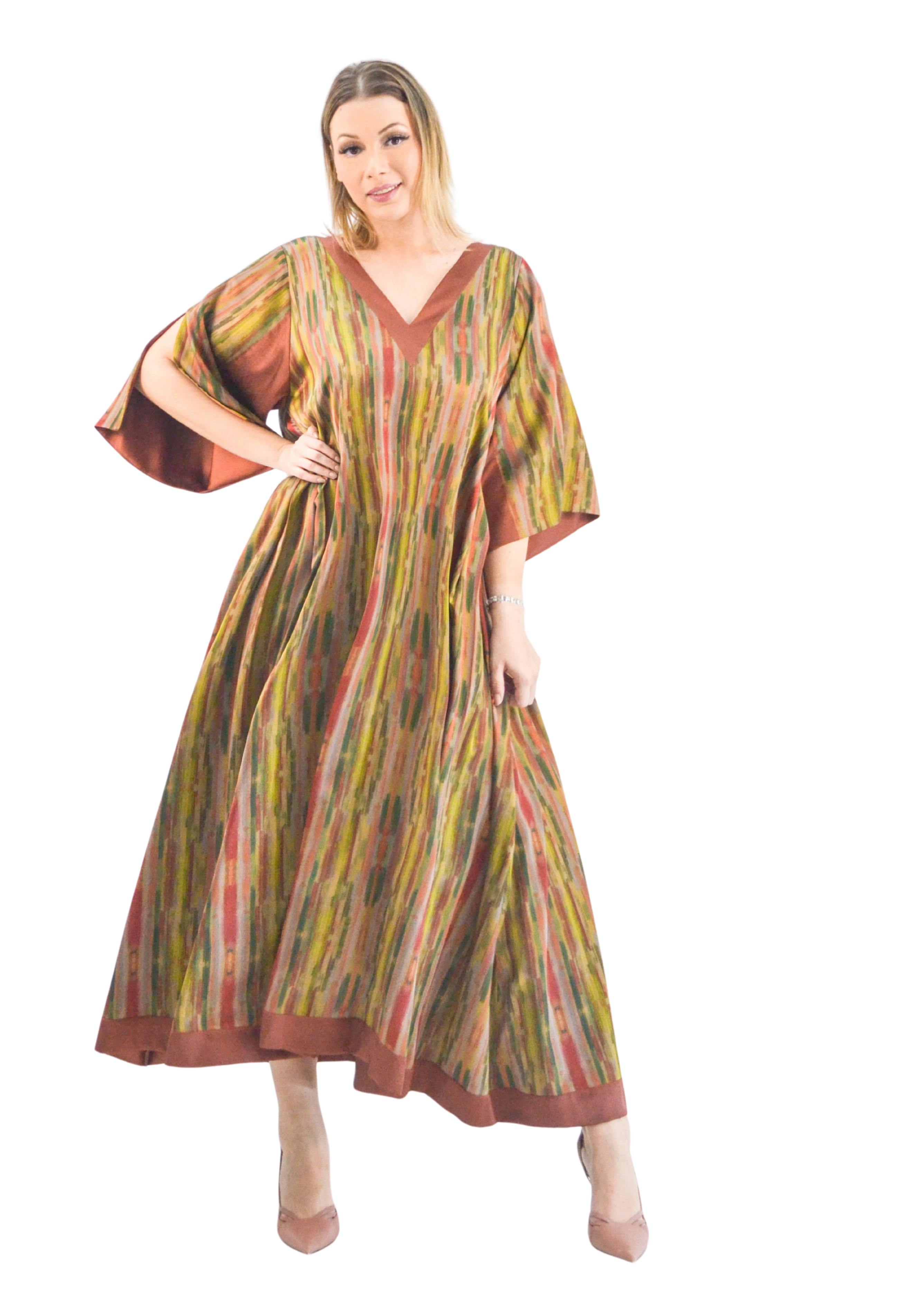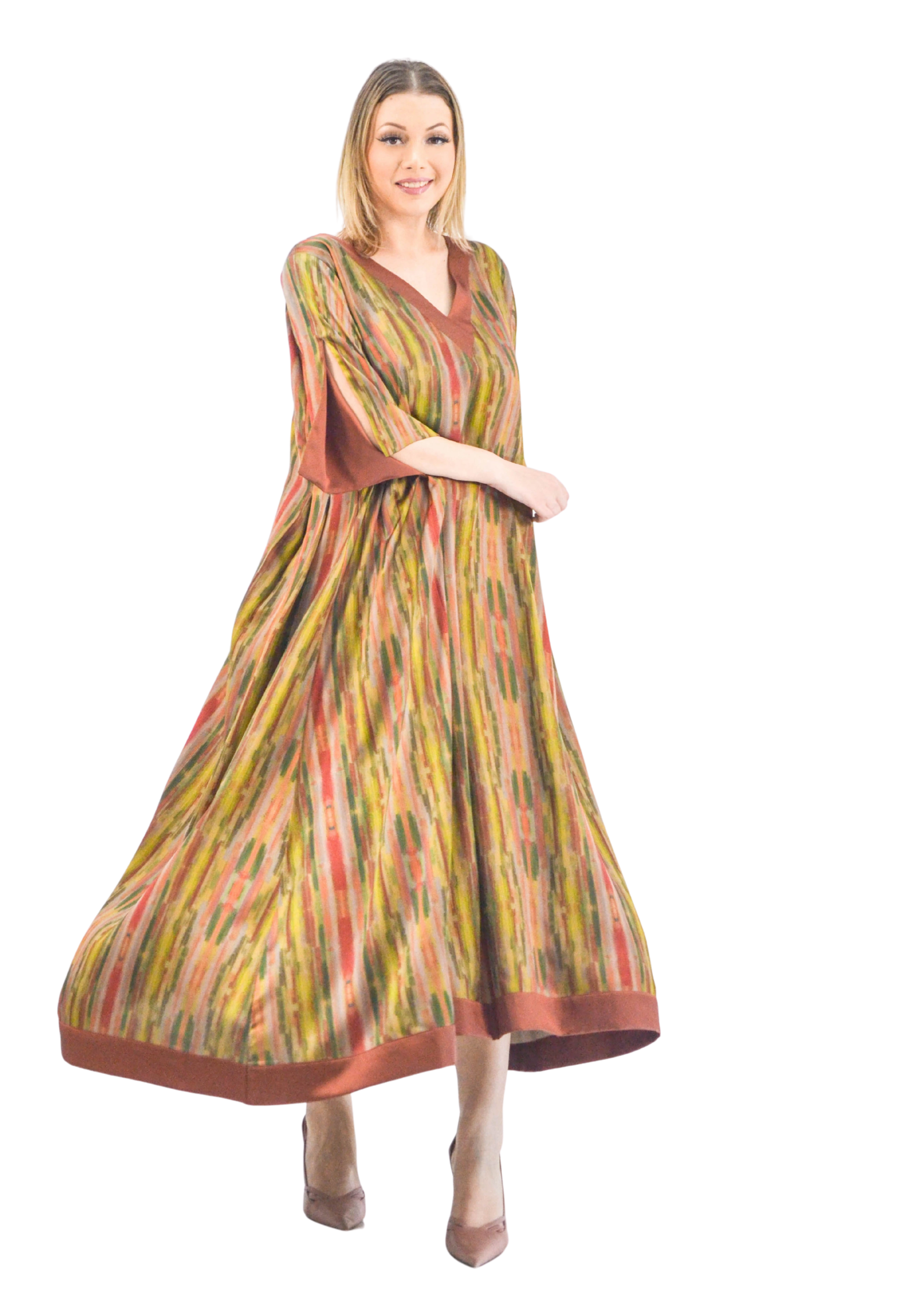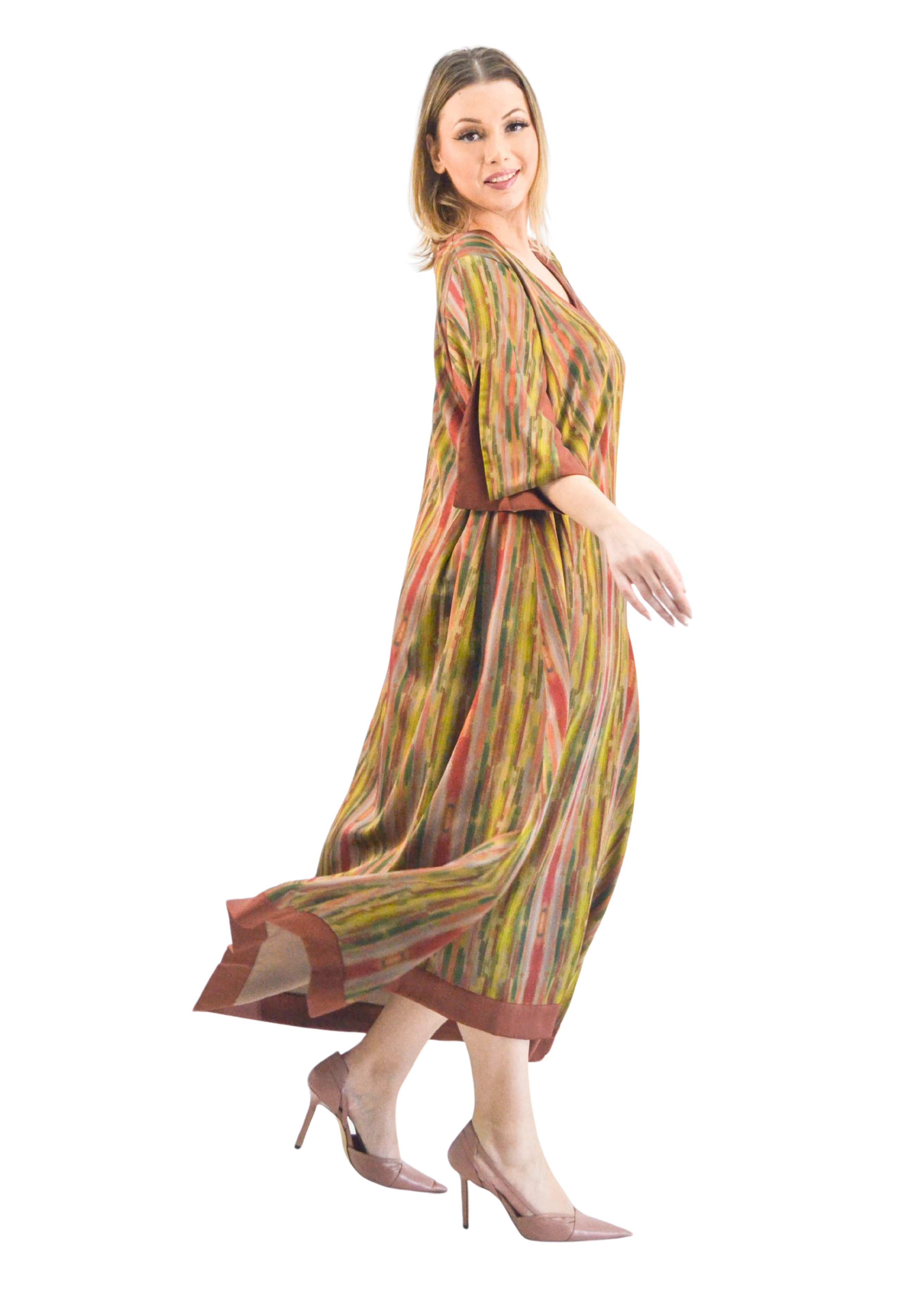 Distinctive Striped Design: Featuring a captivating vertical stripe pattern in earthy tones of green, brown, and gold, this maxi dress adds a touch of artistic flair to your wardrobe. The rich colors are perfect for any season, making it a versatile choice for various occasions.